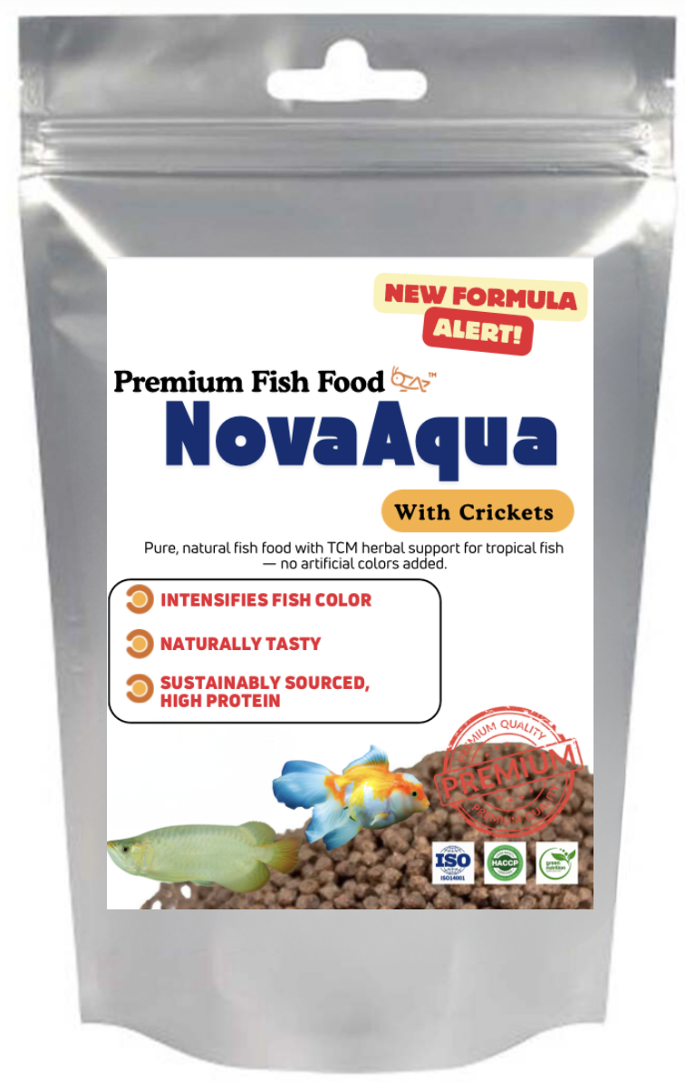 NovaAqua Fish Food — Nutrient-rich fish feed with sustainably farmed cricket meal and Traditional Chinese Medicine botanicals. Promotes robust growth, vibrant color, strong immunity, and balanced digestion for ornamental and food fish. Crafted for fry to adult stages; ideal for pond and aquarium use.